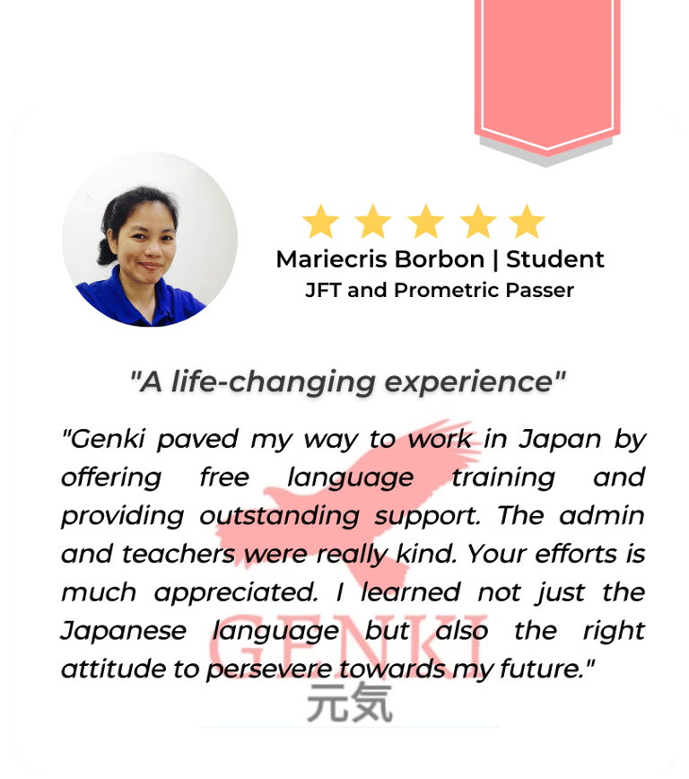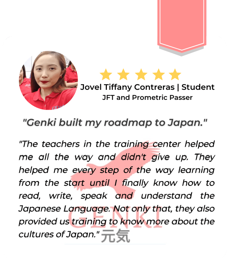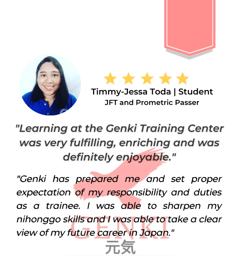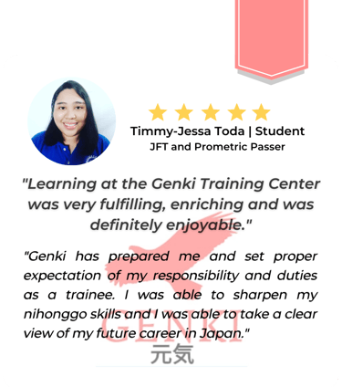 GENKI LANGUAGE PROFICIENCY TRAINING CENTER INC. is a TESDA-accredited Technical Vocational Institution (TVI) to conduct Japanese Language and Culture N4 (Level II). It is an established training center recognized by Securities Exchange Commission (SEC) as a corporation located at the Rm 301-309 Cabrera Bldg I, No. 130 Timog Ave. Brgy. Sacred Heart Quezon City, Philippines. The Genki Sponsorship Program is designed by our affiliated Japanese partners in providing free language training, and learning materials and assistance for qualified Filipino applicants. Genki was created due to the significant demand of the Japanese Government in accepting Filipino workers to work in senior home care facilities and other related medical services in Japan. Our Technical Vocational Institution (TVI)is managed by professionals and experts in the field of education devoted to honing trainees in achieving their training objectives and acquiring Japanese language proficiency certification by The Japan Foundation and nursing care skill evaluation test required by the Ministry of Health, Labor and Welfare of the Japanese Government.